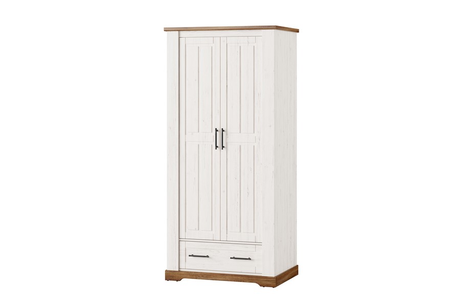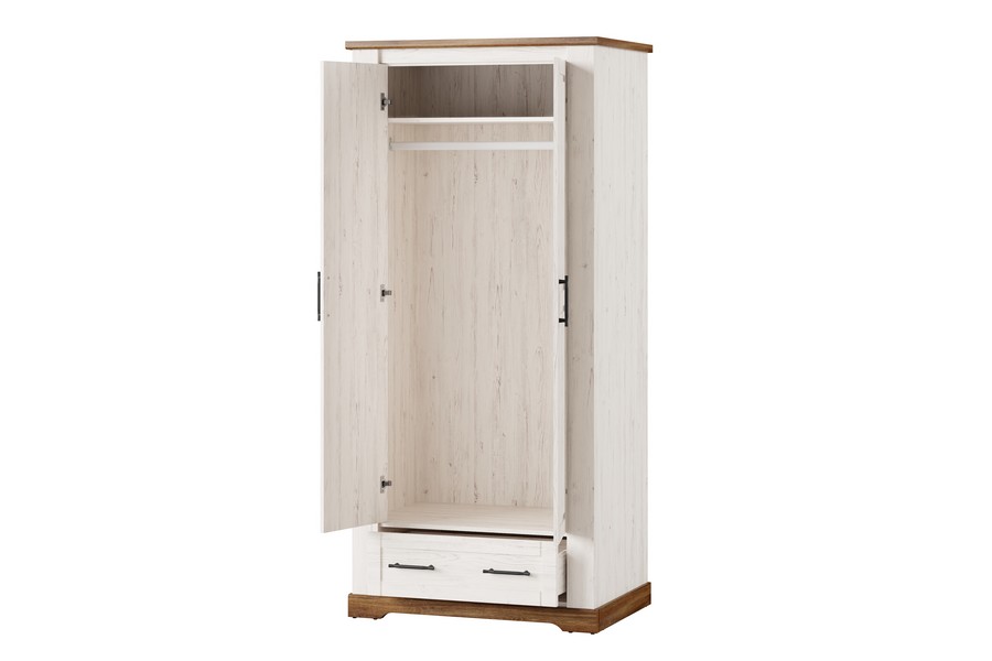 Dwudrzwiowa klasyczna szafa z drążkiem na ubrania, pojemną szufladą na akcesoria i głęboką półką wewnątrz. Klasyczna bryła w ciepłej kolorystyce dębu stirling i sosny andersen, jasny kolor kontrastuje tu z ciemniejszymi elementami ozdobnymi, które znajdują się w górnej i dolnej części mebla. Szafa z pewnością przypadnie do gustu wielbicielom stylu prowansalskiego, szczególnie dedykowana jest osobom ceniącym sobie praktyczność oraz staranne wykonanie.