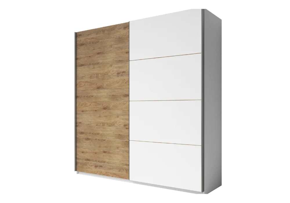 Szafa posiada dwa przesuwne skrzydła. Konstrukcja wykonana z wysokiej jakości laminowanej płyty meblowej gwarantuje trwałość i odporność na codzienne użytkowanie. Kolorystyka biel w połączeniu z dębem beaufort nadaje wnętrzu nowoczesny i świeży wygląd.