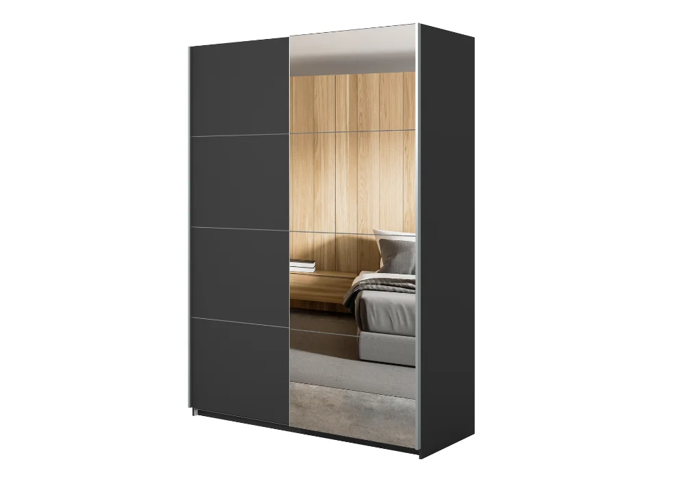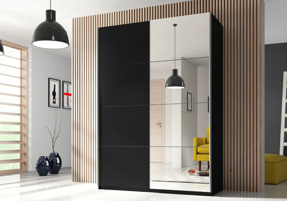 Szafa przesuwna Beta to eleganckie i praktyczne rozwiązanie, które pozwoli Ci uporządkować przestrzeń w sypialni, przedpokoju czy garderobie. Jej głęboka, czarna kolorystyka nadaje wnętrzu nowoczesny charakter, a lustro na froncie optycznie powiększa pomieszczenie i dodaje mu lekkości.