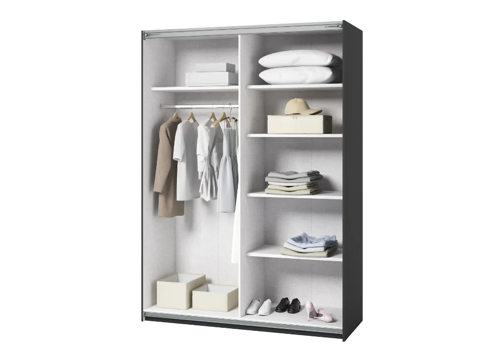 Wnętrze zostało zaprojektowane z myślą o funkcjonalności – część z drążkiem idealnie nadaje się do przechowywania odzieży wiszącej, a pięć pojemnych półek pomieści ubrania, akcesoria i inne przedmioty codziennego użytku.