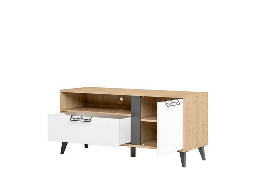 Z szafką RTV z kolekcji Moat stworzysz wygodne i eleganckie miejsce codziennego relaksu. Funkcjonalna szuflada zapewnia sporo miejsca do przechowywania, doskonałe wykonanie i niebanalny design. Kombinacja kolorystyczna biały mat, orzech amerykański i matowy grafit pozwala na możliwość łączenia kolekcji z innymi meblami również w tych odcieniach.
