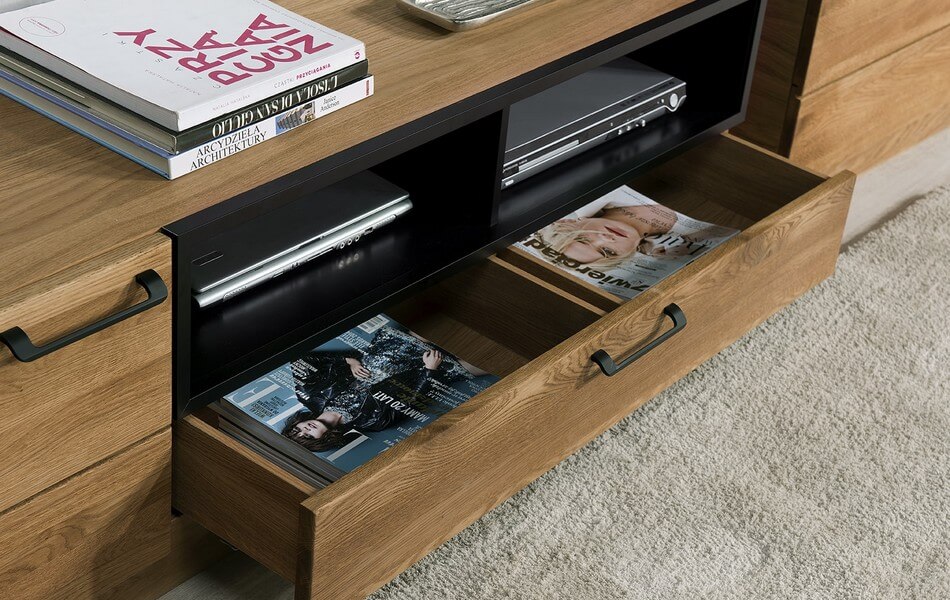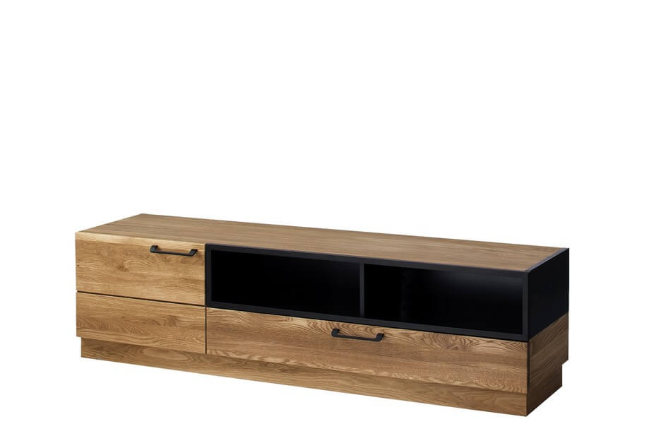 W szafce znajdziemy miejsce do przechowywania a funkcjonalna forma mebla pozwoli ukryć elementy okablowania. Dąb miodowy zestawiony z czarnymi akcentami prezentuje się modnie i interesująco.