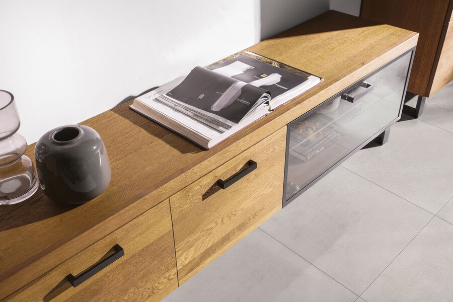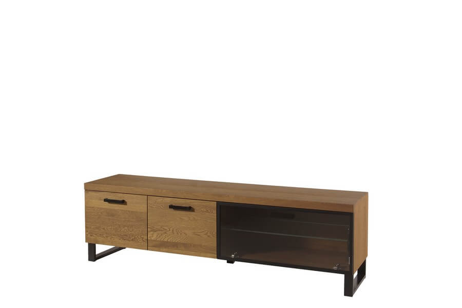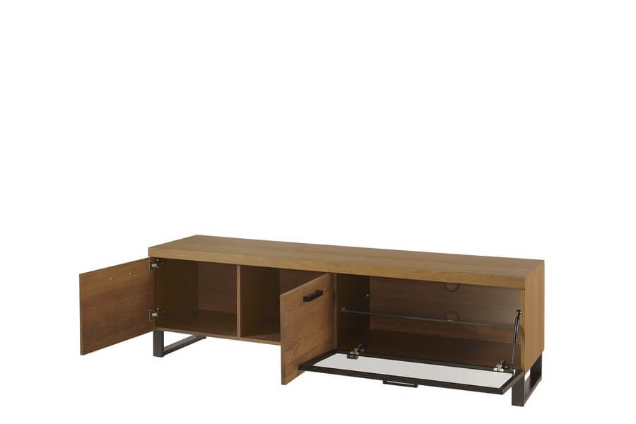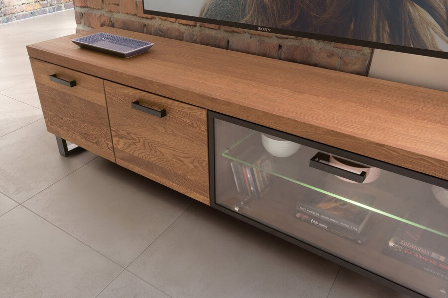 Szafka wyposażona są w praktyczne udogodnienia, przestrzeń na dekoder, otwory na kable. Fronty z litego, szczotkowanego drewna w kolorze dąb rustical połączone z metalowymi detalami podkreślą niepowtarzalność szafki.