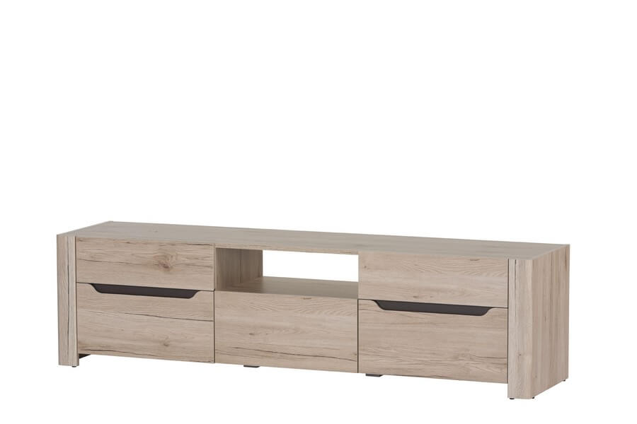 Duża szafka RTV z półkami i pojemną szufladą na akcesoria oraz półką na dekoder lub odtwarzacz to doskonały wybór do pokoju dziennego. Zachowana w jasnej kolorystyce dębu san remo z elementami brązu uni, charakterystycznymi dla tej kolekcji.