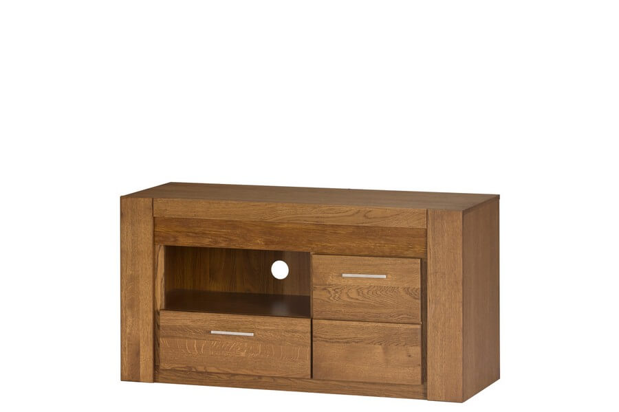 Szafka RTV z linii Velvet podkreśla naturalne piękno litego drewna, dzięki czemu prezentuje się elegancko i ponadczasowo.