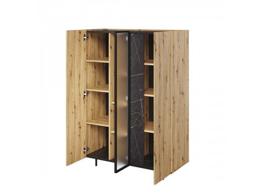 Stojąca szafka pokojowa MR-05 z kolekcji MARMO to połączenie różnych elementów stylistycznych, takich jak ciepły kolor drewna, czarna płyta z marmurowym wzorem oraz zdobione szkło ornamentowe master ligne, pozwoli Ci stworzyć harmonijną aranżację, pełną nowoczesnej elegancji.