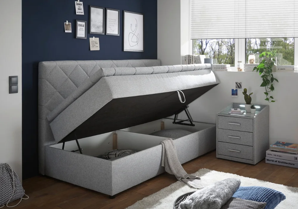 Komfort snu zapewnia zastosowanie sprężyn pocket, które pracują niezależnie i dobrze dopasowują się do ciała, oraz pianki wysokoelastycznej, zwiększającej wygodę i trwałość powierzchni spania. Dzięki takiej konstrukcji tapczan sprawdzi się zarówno jako łóżko dziecięce, jak i młodzieżowe.