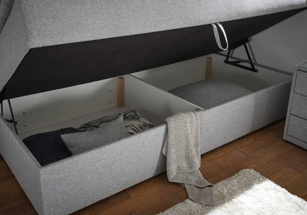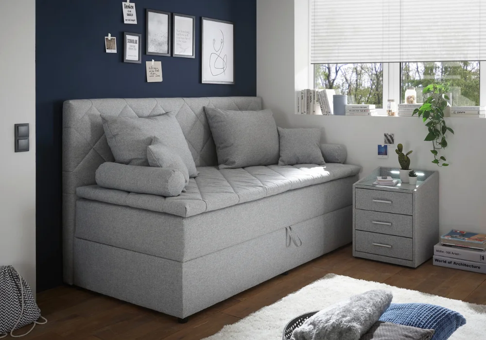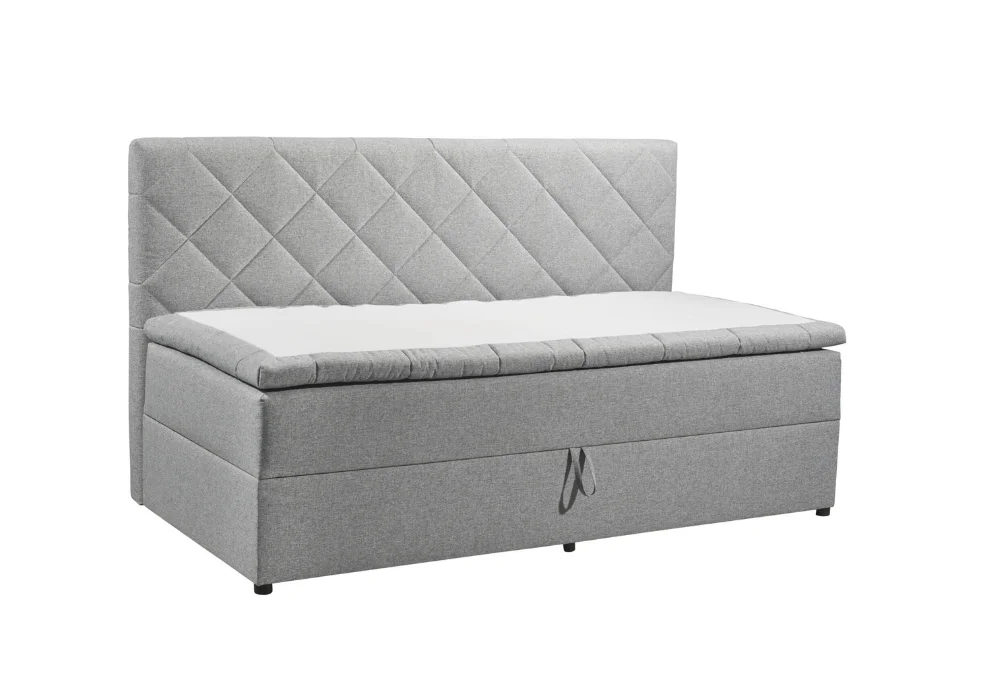 Ciekawym elementem modelu Milo jest odwracany topper, który pełni dwie funkcje. Z jednej strony pokryty jest tkaniną tapicerską, dzięki czemu estetycznie współgra z całością tapczanu i tworzy spójną, uporządkowaną bryłę. Po odwróceniu topper wykończony jest miękką tkaniną, zapewniając komfortową powierzchnię do spania i relaksu.