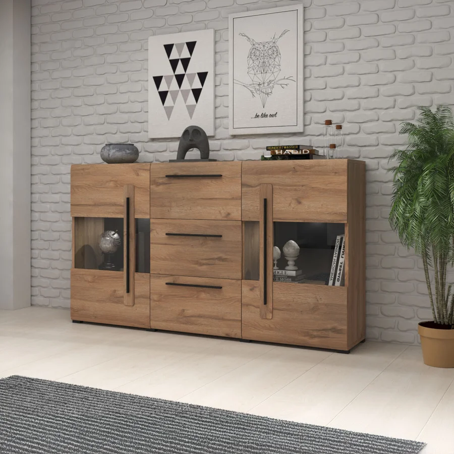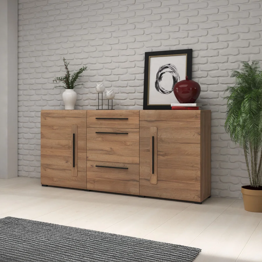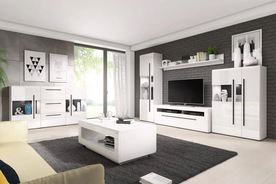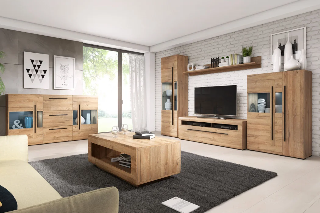 Wyróżnia się elegancką, geometryczną formą oraz dopracowanymi detalami. Zastosowane w komodach i szafkach – cichy domyk oraz szuflady z pełnym wysuwem – podnoszą komfort codziennego użytkowania i podkreślają dbałość o szczegóły.