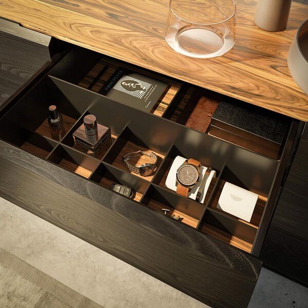 Pastelowa bejca podkreśla kunsztowne, dębowe fronty, które zostały zestawione z wyrazistym fornirem – palisandrem brazylijskim skrawanym płasko. Zastosowano istotne detale: urokliwy frez przy frontach, opcjonalne oświetlenie, akcesoria szuflad, wertykalne wstawki, system push to open.