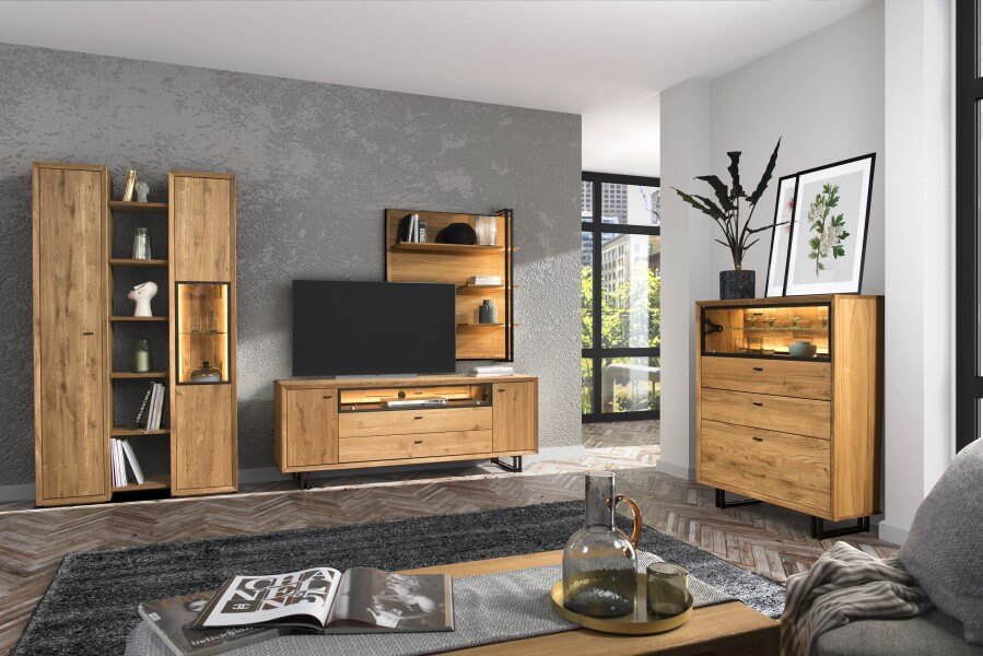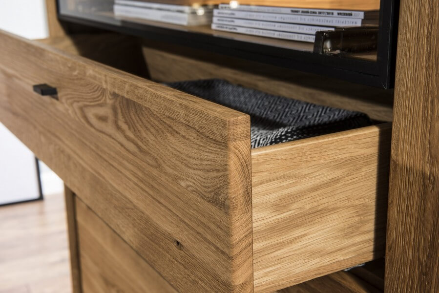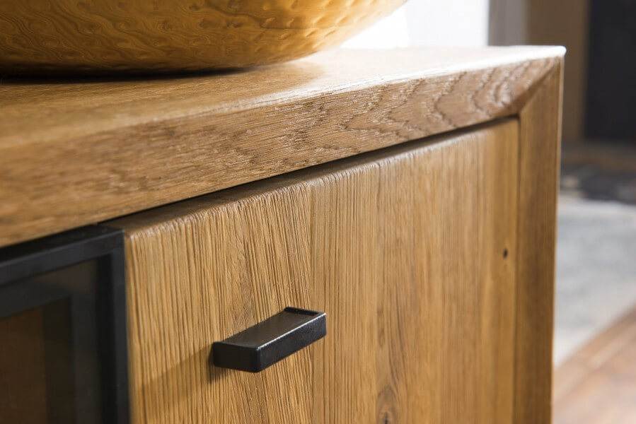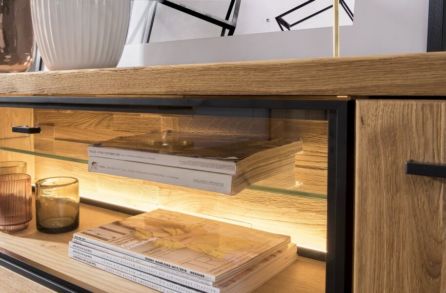 Meble z kolekcji Vigo zachwycają harmonijnym połączeniem litego drewna dębowego i metalowych akcentów. Specjalne szczegóły, takie jak podświetlana ściana tylna, oraz loftowe dodatki spełnią wymagania najbardziej wymagających.