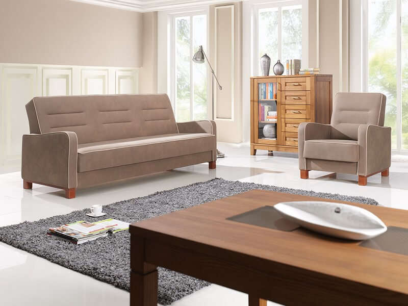 Prosta, geometryczna forma wypoczynku stanowi kwintesencję dobrego smaku. Produkt jest również dostępny w pełnej gamie tkanin, umożliwiając klientom wybór odpowiedniego materiału. Całość aranżacji warto uzupełnić wygodnym fotelem Oliwia 06.