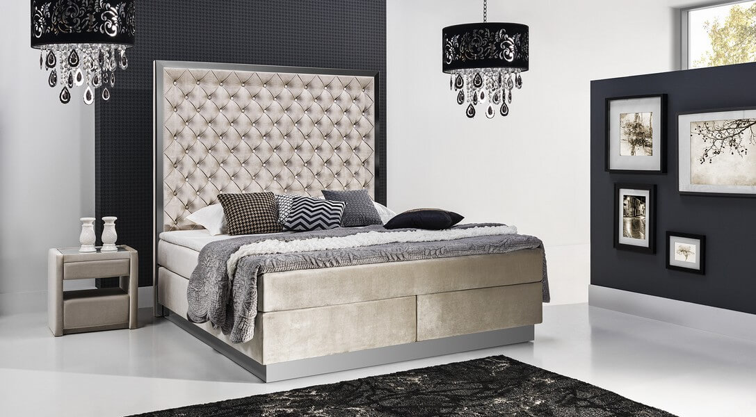 Łóżko kontynentalne z wezgłowiem 700 o wysokości 180 cm to ekskluzywne i niebywale eleganckie łóżko, które wyróżnia się majestatyczną i bardzo dekoracyjną bryłą. Bogato pikowane wysokie wezgłowie, zamknięte w metalowej lub drewnianej ramie, a całość spina analogiczny cokół łóżka.