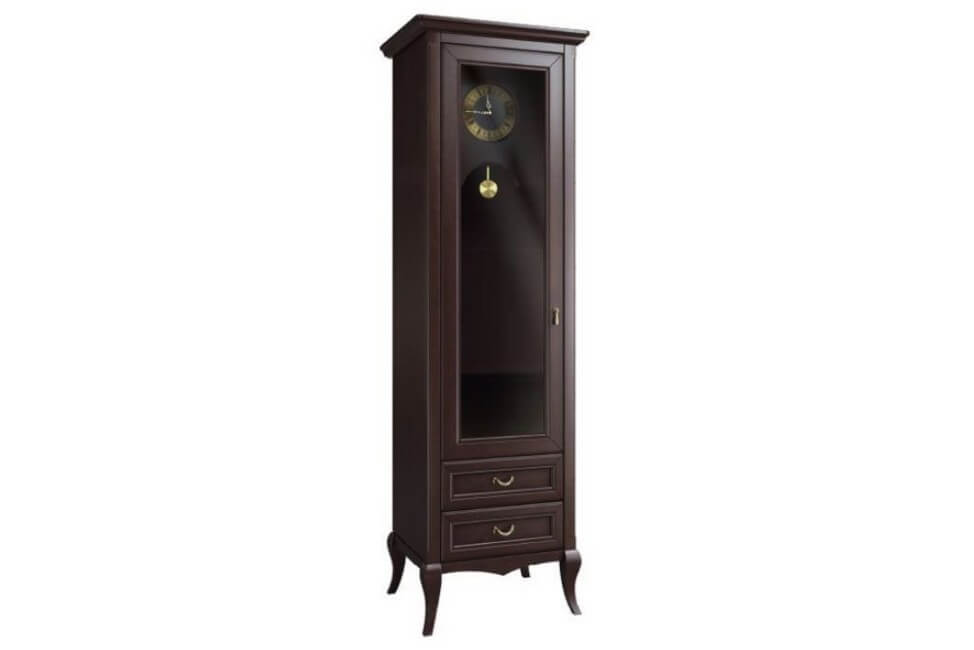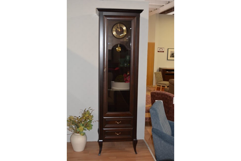 Zegar kwarcowy 1DS2SZ – posiada 1 drzwi przeszklone (szkło Antisol) i 2 szuflady. Zegar wykonany w wybarwieniu wenge patyna. Wymiary: szer. 63 cm, wys. 205 cm, gł. 55 cm.