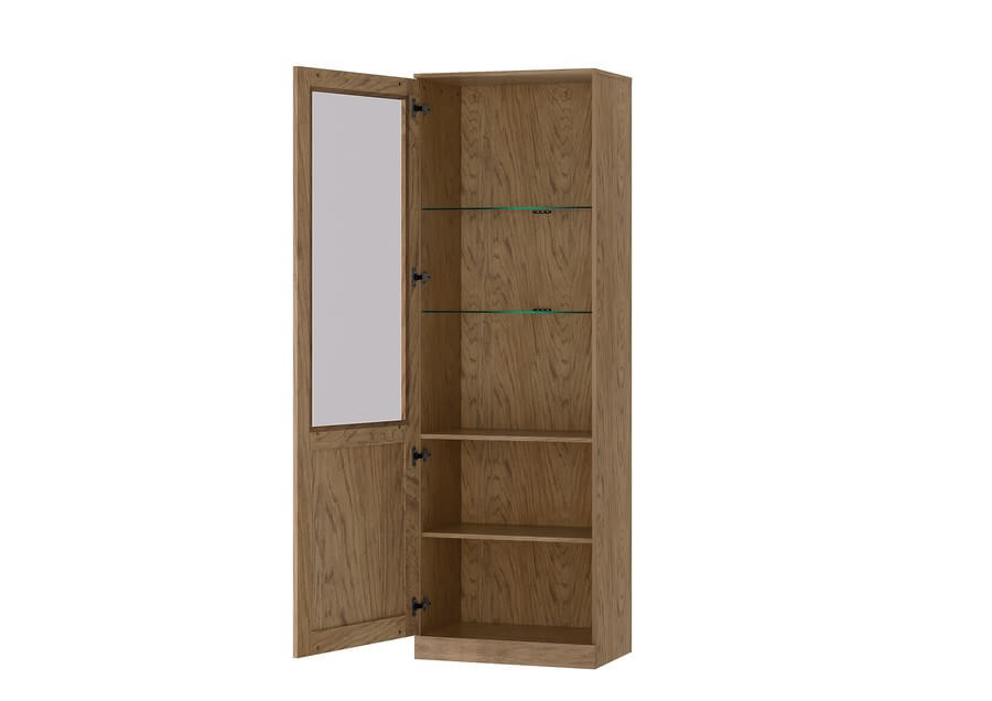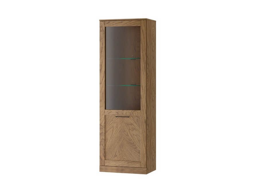 Witryna 1-drzwiowa lewa Cozy zapewni dodatkowe miejsce do wykorzystania i pozwoli wyeksponować ulubione przedmioty. Witryna wykonana w kolorystyce naturalnego drewna dębowego z oświetleniem przestrzeni oszkolonych, wprowadzi do naszych pomieszczeń wyjątkowy nastrój i niepowtarzalny urok. Na przeszklonych półkach doskonale będą prezentowały się eleganckie dodatki i pamiątki.