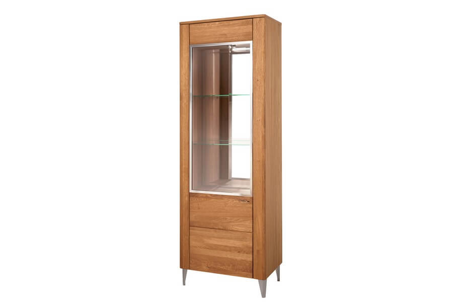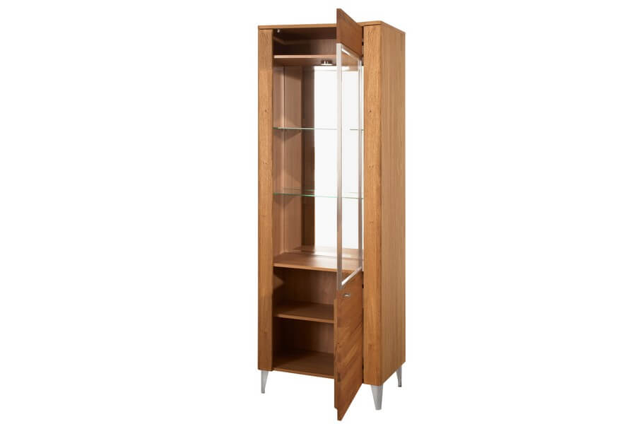 Witryna 1-drzwiowa Latina to wyjątkowy mebel, który z pewnością przykuje wzrok wszystkich gości odwiedzających nasz dom. Znajdzie swoje miejsce zarówno w salonie, jak i w jadalni. Witryna wykonana jest w kolorze dębu miodowego, który wprowadzi do naszych pomieszczeń błogi nastrój. Fronty witryny wykonane z litego drewna z widoczną strukturą podkreślają masywność i wyjątkowy charakter mebla.