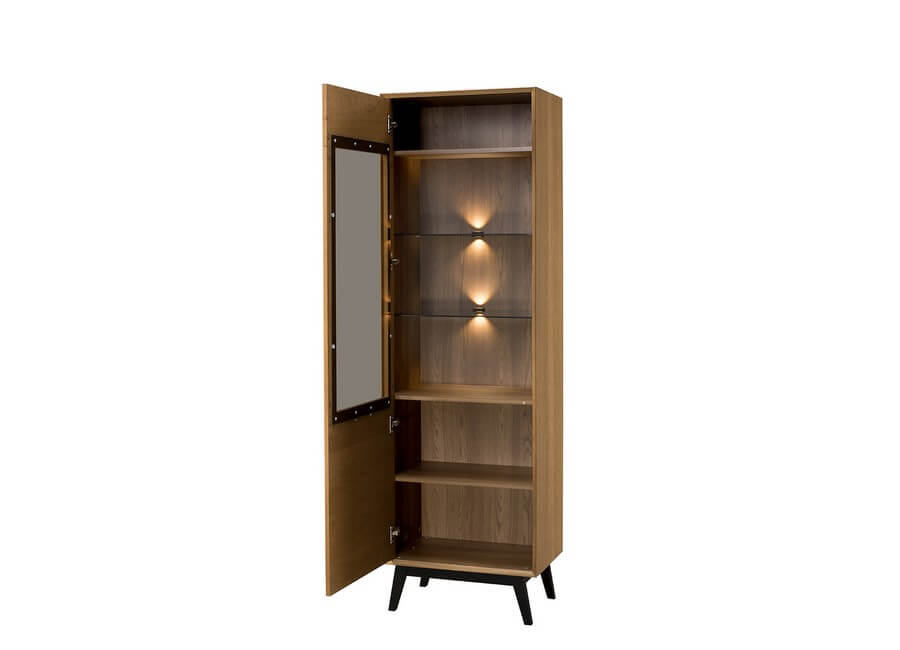 Wykończona naturalną okleiną dębową w ciepłym odcieniu karmelowego dębu rustical, witryna posiada przeszklone drzwiczki oraz sześć półek, idealnych do wyeksponowania cennych przedmiotów. Standardowe oświetlenie LED dodatkowo podkreśla elegancję wnętrza.