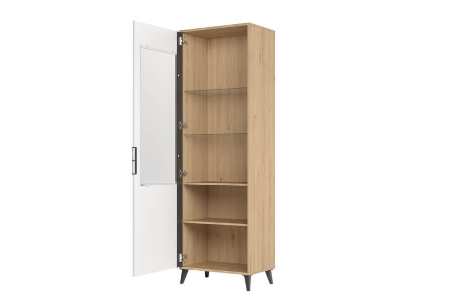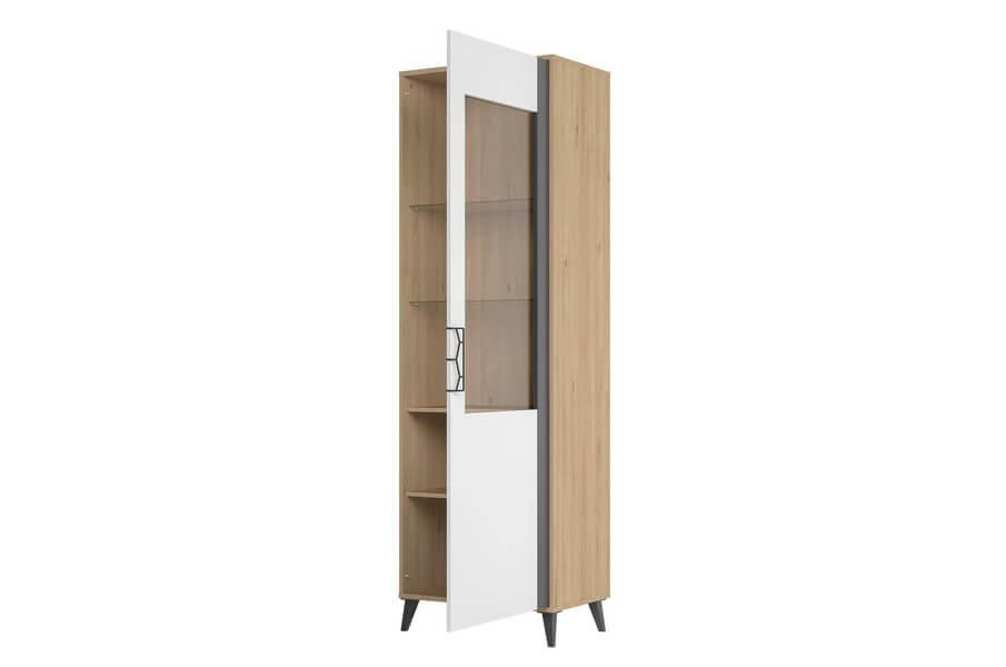 Witryna jednodrzwiowa dedykowana jest dla osób poszukującym funkcjonalnych, modnych mebli w stylu skandynawskim. Witryna wykonana w kolorystyce matowej bieli i orzecha amerykańskiego jackson, rozjaśni każde wnętrze nadając mu wyjątkowego stylu. Na przeszklonych półkach doskonale będą prezentowały się eleganckie dodatki i pamiątki.