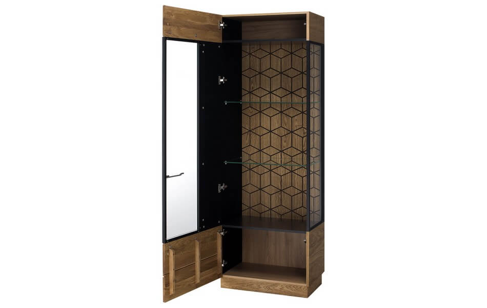 Witryna jednodrzwiowa z kolekcji Mosaic to nowoczesny design przy wykorzystaniu najwyższej jakości drewna oraz staranne wykonanie z dbałością o każdy detal. Zapewni dodatkowe miejsce do wykorzystania i pozwoli wyeksponować ulubione przedmioty.
