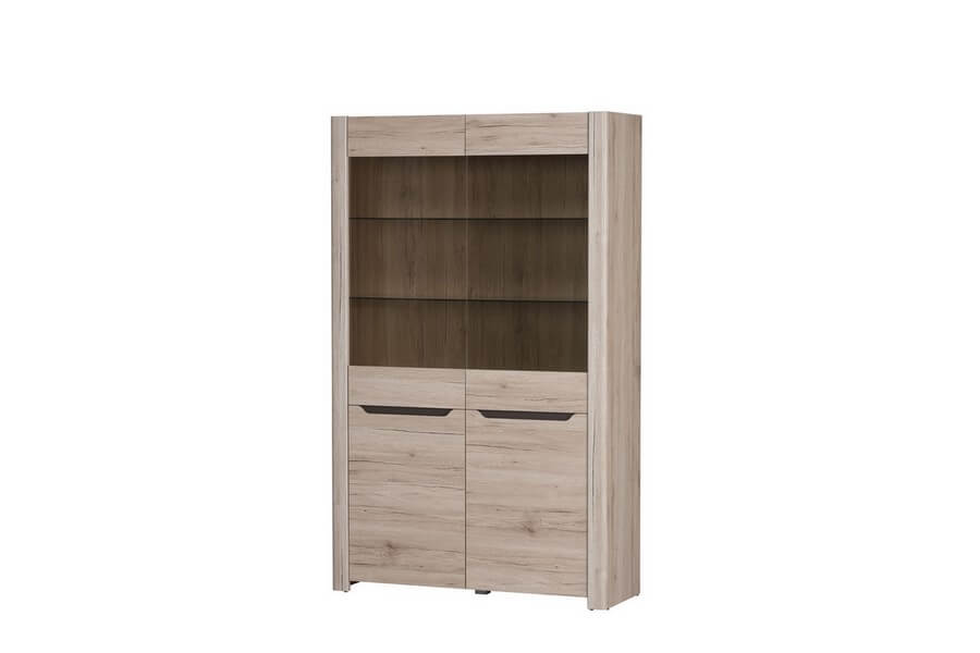 2-drzwiowa witryna z przeszkleniem, pozwoli wyeksponować różne elementy dekoracyjne a dzięki dodatkowemu opcjonalnemu oświetleniu możemy nadać jej wyjątkowy charakter. Desjo to nowoczesna witryna pasująca do każdego wnętrza, dzięki uniwersalnej kolorystyce dębu san remo z wstawkami w kolorze brązu uni odnajdzie się w wielu aranżacjach.