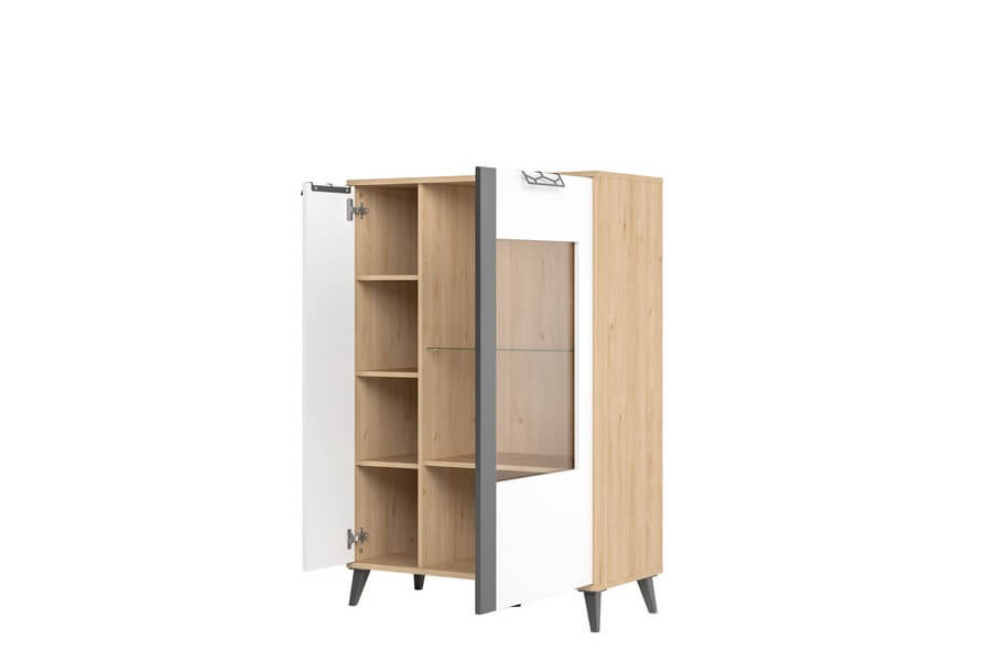 Witryna dwudrzwiowa niska dedykowana do nowoczesnych wnętrz w stylu skandynawskim. Cechuje się precyzyjnym wykonaniem i pewnością zadowoli najbardziej wymagających użytkowników. Funkcjonalne półki stanowią doskonałe miejsce do przechowywania.