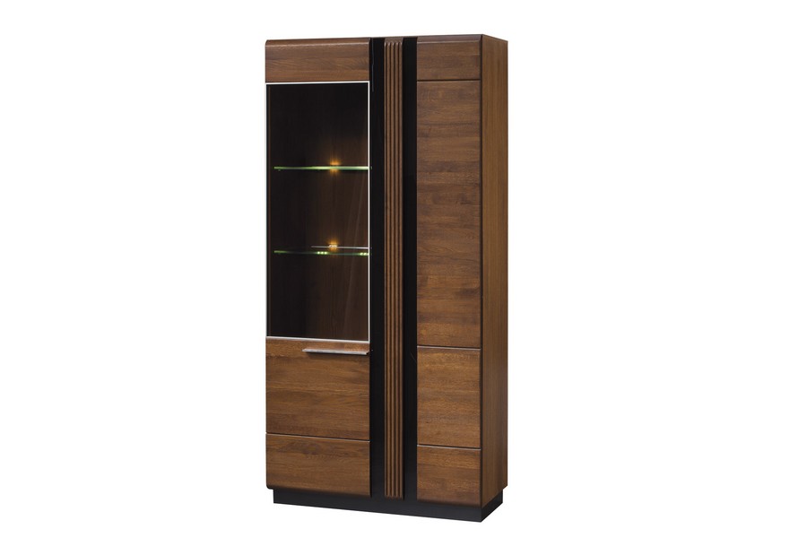 Front witryny wykonano z litego drewna, co dodatkowo podkreśla jej elegancję. Ryflowane elementy ozdobne w sąsiedztwie klasycznej czerni doskonale wpasowują się w aktualne trendy. Metalowe wykończenia uzupełniają całość.