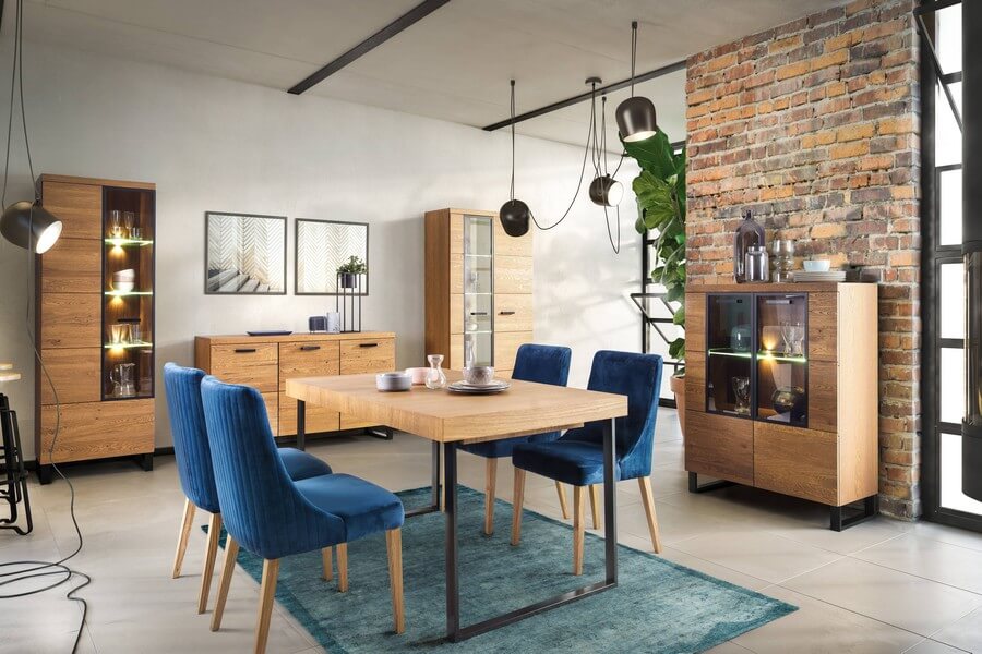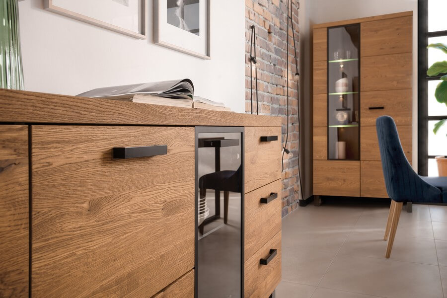 Fronty z litego, szczotkowanego drewna w kolorze dąb rustical połączone z metalowymi detalami podkreślą niepowtarzalność spędzanych w domowym zaciszu chwil.