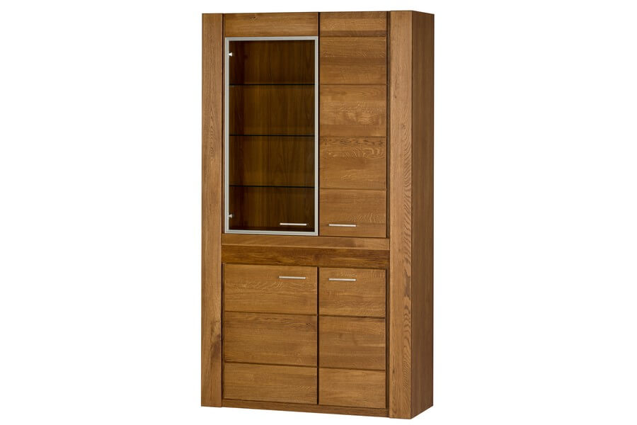 Mebel został wykonany przy użyciu naturalnych materiałów, dzięki czemu wyróżnia się trwałością i wysoką jakością. Szlachetny dekor dębu ristical i charakterystyczna podświetlana wstawka ze szropowanego drewna litego podkreśla naturalne piękno projektów.