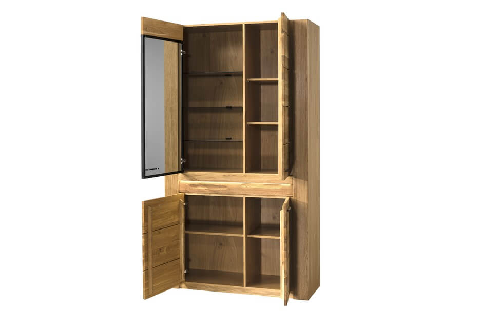 Wykorzystanie litego drewna dębowego oraz fornirowanej płyty meblowej gwarantuje trwałość i wysoką jakość mebla. Przestronne półki idealne do przechowywania i organizowania wielu rzeczy, od książek po naczynia.