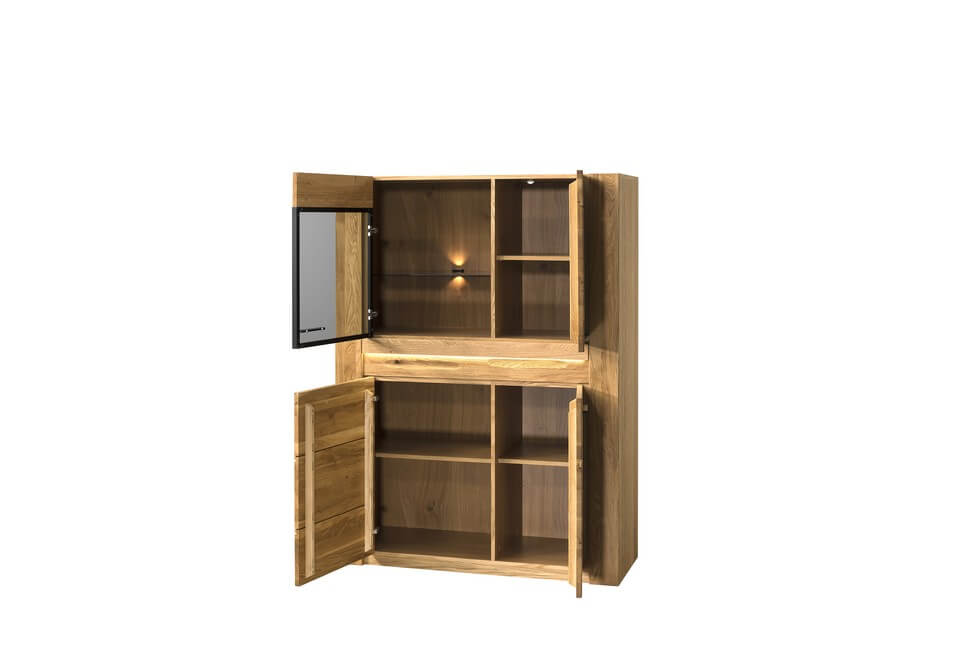 Wykorzystanie litego drewna dębowego oraz fornirowanej płyty meblowej gwarantuje trwałość i wysoką jakość mebla. Pojemne półki schowane za pełnymi drzwiami, doskonale nadają się do przechowywania różnorodnych przedmiotów i akcesoriów.