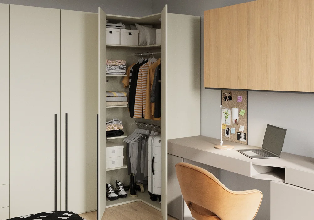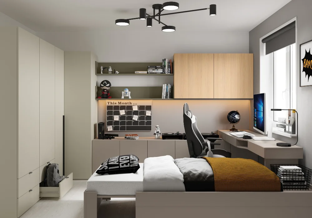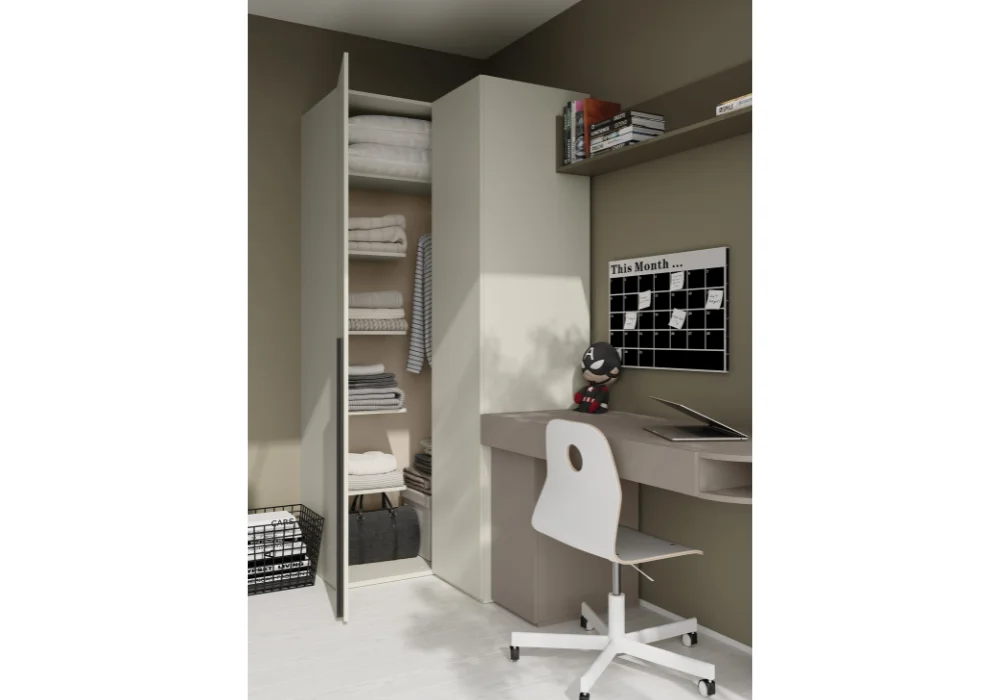 Centralnym punktem zestawu jest funkcjonalne biurko, przy którym dziecko uczy się, rozwija pasje i spędza twórcze chwile. Dopełnieniem aranżacji są regały, szafki, narożne szafy oraz rozsuwane łóżko, które świetnie sprawdza się w codziennym użytkowaniu.