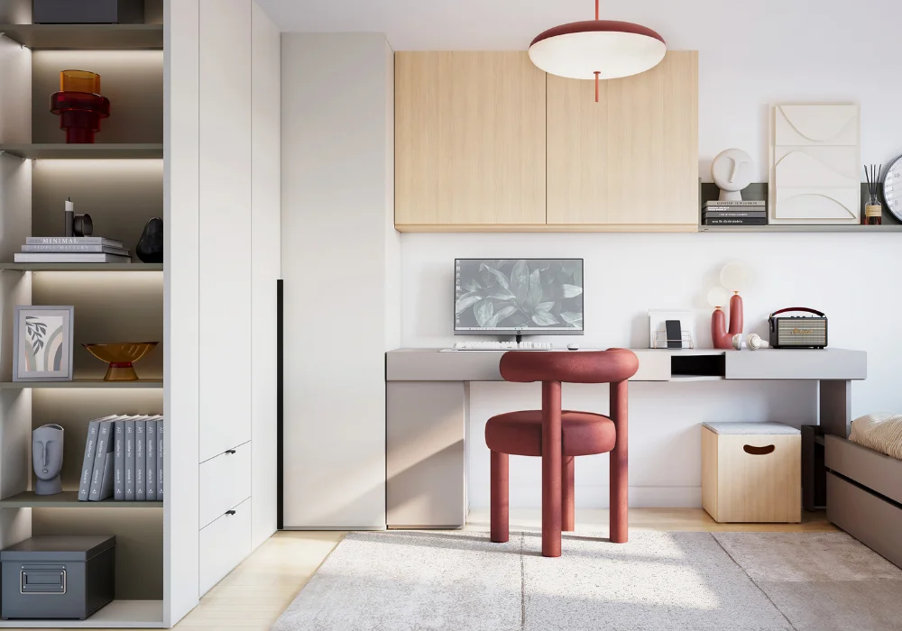 Projektanci postawili na ciepłą, neutralną kolorystykę, dzięki czemu pokój może zmieniać się wraz z dzieckiem – od przestrzeni pełnej zabawek po nowoczesne wnętrze nastolatka. To rozwiązanie, które daje swobodę aranżacji, pomaga wykorzystać każdy centymetr przestrzeni i wspiera rozwój młodego człowieka.