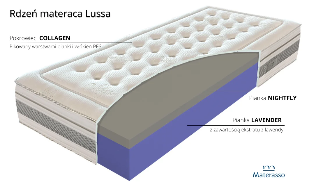 Materac Lussa został zaprojektowany dla osób, które oczekują stabilnego podparcia ciała, a jednocześnie cenią spokojny i relaksujący klimat w sypialni. Jego konstrukcja łączy nowoczesne technologie pianek z naturalnym ekstraktem z lawendy, który wprowadza do snu element delikatnej aromaterapii. Dzięki temu materac nie tylko wspiera kręgosłup, ale także pomaga wyciszyć organizm po długim dniu.
