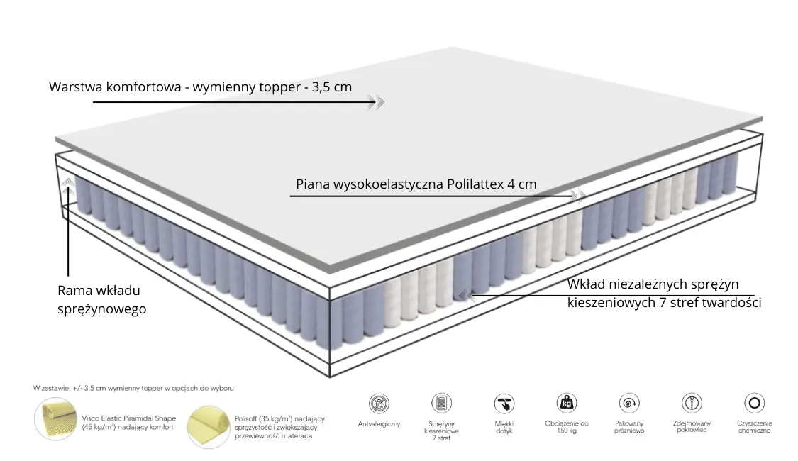 1. Warstwa komfortowa – wymienny topper z pianki Visco Piramidal Shape lub Polisoff do wyboru – 3,5 cm