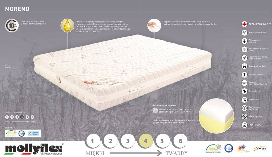 Materac MORENO jest produktem wypoczynkowym i relaksacyjnym. Model ten należy do tzw. grupy popularnych materaców pasywnych. Są one coraz bardziej popularne dzięki swoim wyjątkowym właściwościom. Górne warstwy materaca wykonano z pianki Visco Pneumatic, która doskonale podpiera ciało oraz rozkłada punktowe naciski, a także redukuje naciski i naprężenia. Wspomniane własności pianki gwarantują idealne podparcie dla kręgosłupa oraz usprawniają krążenie krwi i relaksują zmęczone mięśnie. Z kolei wysokoelastyczna pianka Polilattex stanowi stabilny rdzeń materaca.